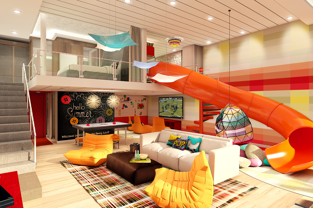 - The Ultimate Family Suite, “the world’s most cutting-edge family stateroom”, according to Royal Caribbean. It will include a cinema room with popcorn machine, in-room slide, LEGO wall, air-hockey table and whirlpool on the balcony